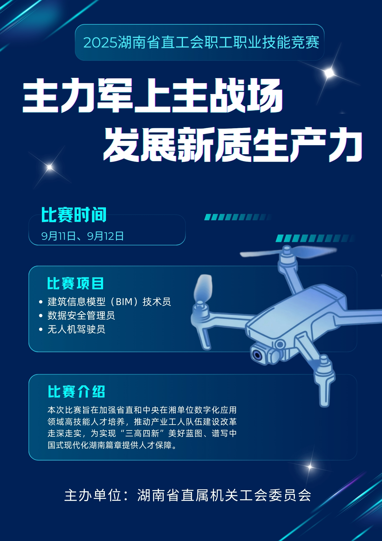 2025年湖南省直工会职工职业技能竞赛将于9月11—12日在湖南科技工程技师学院(长沙建筑工程学校)举办,竞赛围绕“主力军上主战场、发展新质生产力”主题,聚焦职工数字化应用技术技能,设置建筑信息模型(BIM)技术员、数据安全管理员、无人机驾驶员3个竞赛工种,将有来自省直和中央在湘单位的44支队伍、111名选手同台切磋,以技会友展风采。