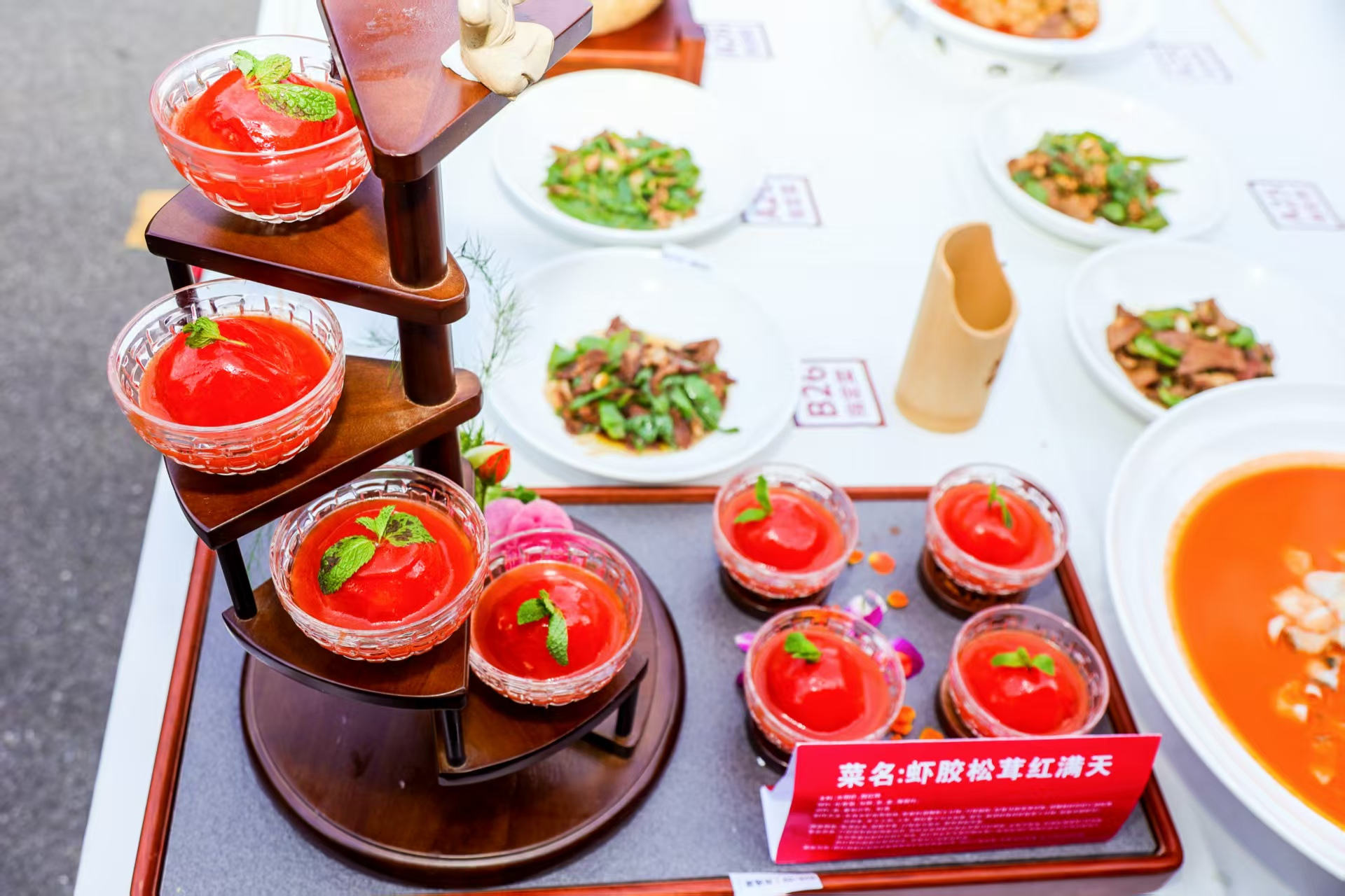 本次大赛以“减盐减油”为核心要求,对参赛厨师的技艺提出了全新挑战。如何在降低盐分和油脂使用的同时,保留并升华湘菜传统的“色、香、味、形”,成为决胜的关键。省直工会代表队的选手们交出了一份完美答卷。他们巧妙运用新鲜食材的本味、通过精准的火候控制、创新的烹饪手法以及天然香辛料的调和,成功创作出了一系列既符合健康标准,又保持了湘菜独特魅力的精品菜肴,其中,龚家祥厨师创作的菜品“虾胶松茸红满天”巧妙打破固有搭配,将大明虾胶酿入镂空的西红柿中蒸制而成。创作全程不放一滴油,利用松茸天然鲜味提鲜,完美契合“减油”主题。虾肉提供优质蛋白与矿物质,西红柿富含维生素C,二者结合不仅酸甜开胃、口感层次丰富,更实现了保护心脑血管、抗氧化促代谢的健康功效,其创新的思路与对健康理念的精准表达,赢得了评委的高度认可。